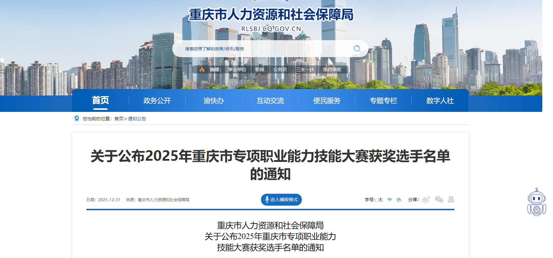 • 【重庆市】关于公布2025年重庆市专项职业能力技能大赛获奖选